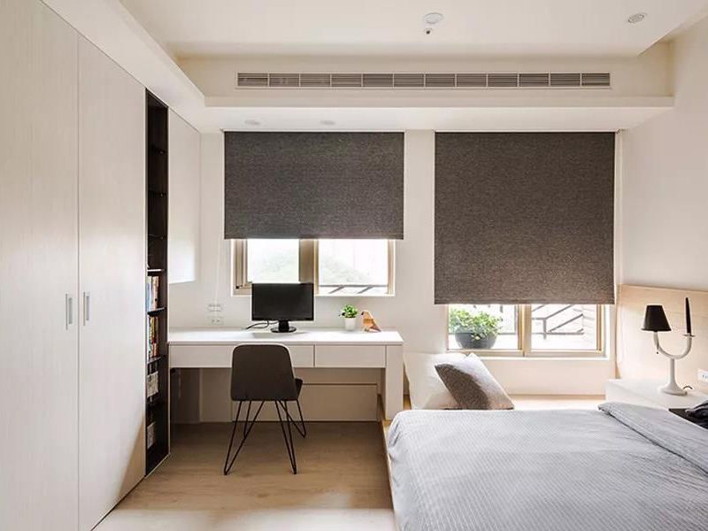 有些业主不喜欢床头位置被占据,只想好好放个床头柜。这种情况下,不妨按照第三种方案:衣柜+书桌一体设计。定制衣柜时,留出一部分空间作为书柜和办公专用,一个小小的书房就出来了。